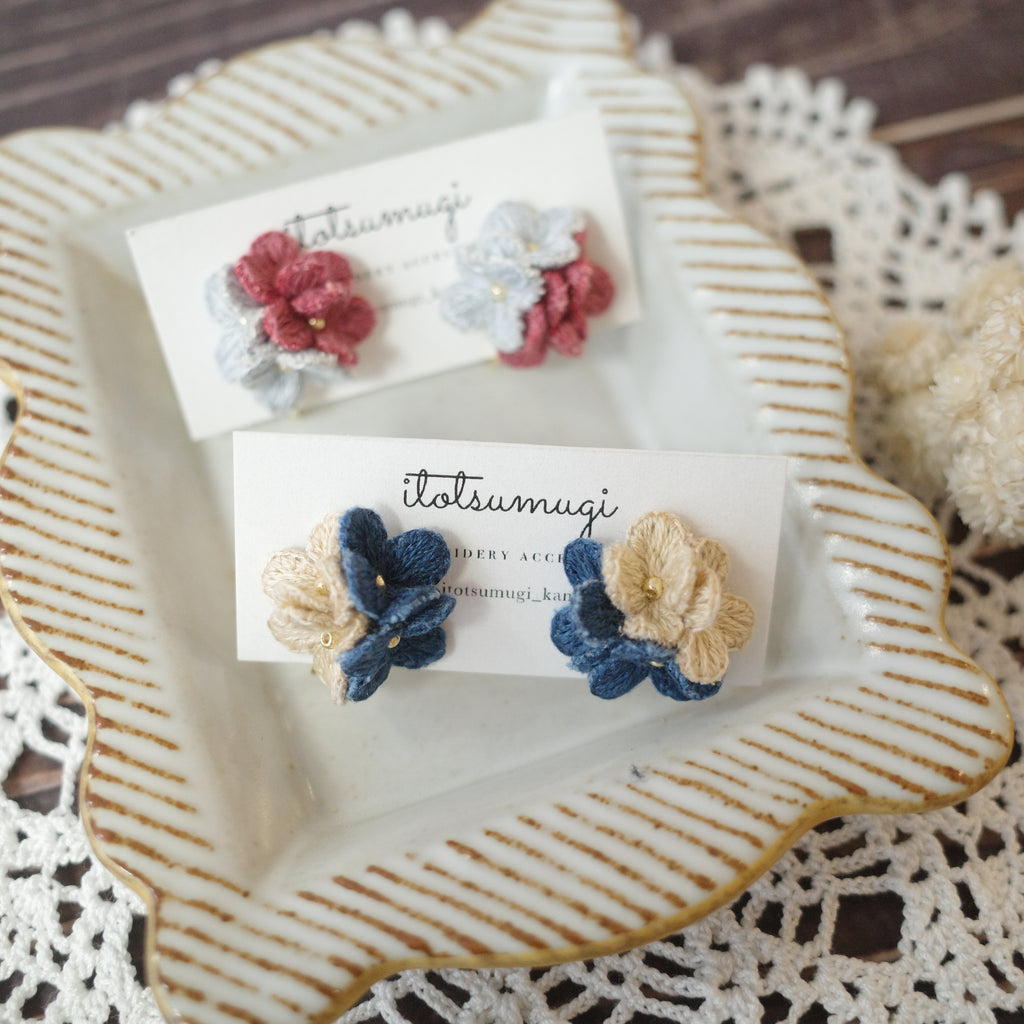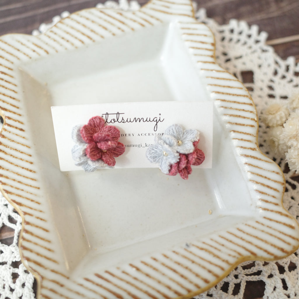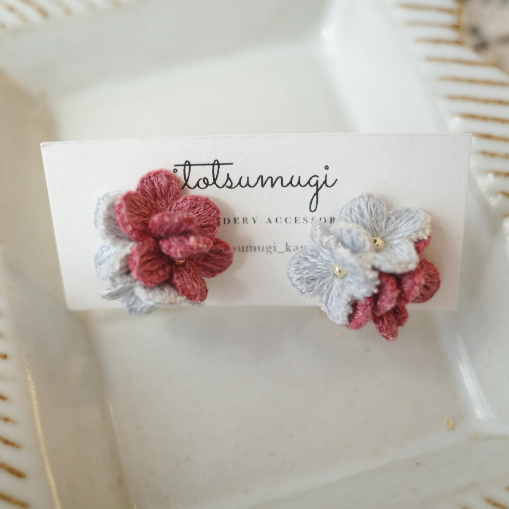 itotsumugi Handmade Accessories - Little Flower Earrings (Grey x Red) No.4
