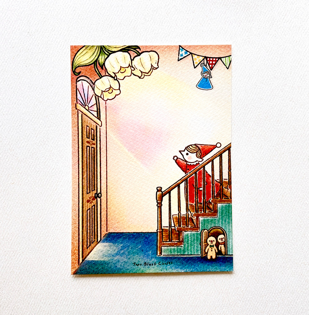 Two black circles - THE ADVENTURE MEMORIES The Little Elf’s Home postcard